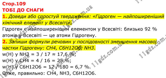 ТОБІ ДО СНАГИ 1. Доведи або спростуй твердження: «Гідроген — найпоширеніший хімічний елемент у Всесвіті». Гідроген є найпоширенішим елементом у Всесвіті: близько 92 % атомів у Всесвіті — це атоми Гідрогену. 2. Запиши формули речовин у послідовності зменшення масової частки Гідрогену: СН4, С6Н12О6, NH3. w(H) у NH3 = 3 / 17 ≈ 17,6 %; w(H) у CH4 = 4 / 16 = 25 %; w(H) у C6H12O6 = 12 / 180 = 6,7 %. Отже, правильно: CH4, NH3, C6H12O6.