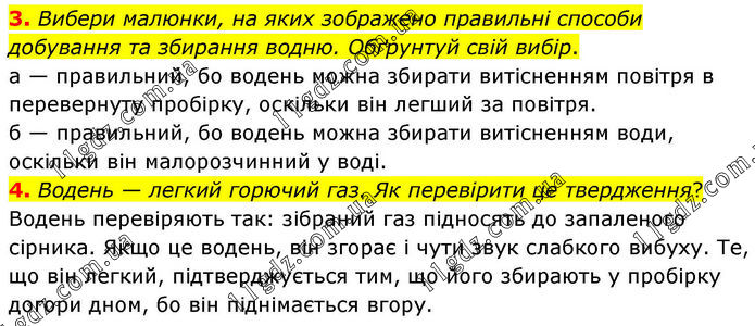 3. Вибери малюнки, на яких зображено правильні способи добування та збирання водню. Обґрунтуй свій вибір. а — правильний, бо водень можна збирати витісненням повітря в перевернуту пробірку, оскільки він легший за повітря. б — правильний, бо водень можна збирати витісненням води, оскільки він малорозчинний у воді. 4. Водень — легкий горючий газ. Як перевірити це твердження? Водень перевіряють так: зібраний газ підносять до запаленого сірника. Якщо це водень, він згорає і чути звук слабкого вибуху. Те, що він легкий, підтверджується тим, що його збирають у пробірку догори дном, бо він піднімається вгору.