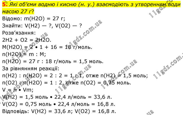 5. Які об’єми водню і кисню (н. у.) взаємодіють з утворенням води масою 27 г? Відомо: m(H2O) = 27 г; Знайти: V(H2) — ?, V(O2) — ? Розв’язання: 2H2 + O2 = 2H2O. M(H2O) = 2 • 1 + 16 = 18 г/моль. n(H2O) = m : M; n(H2O) = 27 г : 18 г/моль = 1,5 моль. За рівнянням реакції: n(H2) : n(H2O) = 2 : 2 = 1 : 1, отже n(H2) = 1,5 моль; n(O2) : n(H2O) = 1 : 2, отже n(O2) = 0,75 моль. V = n • Vm; V(H2) = 1,5 моль • 22,4 л/моль = 33,6 л. V(O2) = 0,75 моль • 22,4 л/моль = 16,8 л. Відповідь: V(H2) = 33,6 л; V(O2) = 16,8 л.
