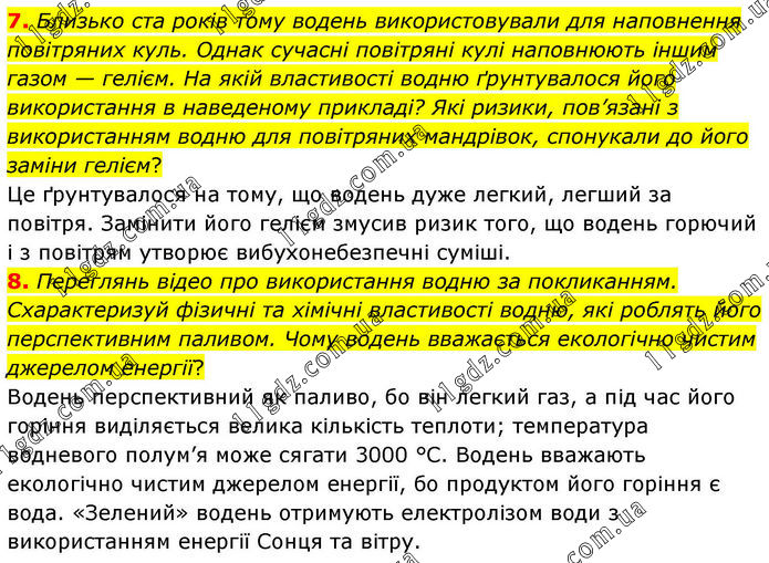7. Близько ста років тому водень використовували для наповнення повітряних куль. Однак сучасні повітряні кулі наповнюють іншим газом — гелієм. На якій властивості водню ґрунтувалося його використання в наведеному прикладі? Які ризики, пов’язані з використанням водню для повітряних мандрівок, спонукали до його заміни гелієм? Це ґрунтувалося на тому, що водень дуже легкий, легший за повітря. Замінити його гелієм змусив ризик того, що водень горючий і з повітрям утворює вибухонебезпечні суміші. 8. Переглянь відео про використання водню за покликанням. Схарактеризуй фізичні та хімічні властивості водню, які роблять його перспективним паливом. Чому водень вважається екологічно чистим джерелом енергії? Водень перспективний як паливо, бо він легкий газ, а під час його горіння виділяється велика кількість теплоти; температура водневого полум’я може сягати 3000 °C. Водень вважають екологічно чистим джерелом енергії, бо продуктом його горіння є вода. «Зелений» водень отримують електролізом води з використанням енергії Сонця та вітру.