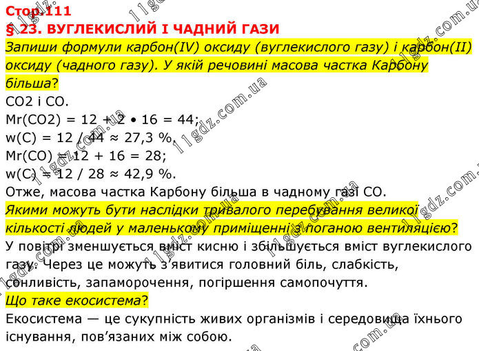 § 23. ВУГЛЕКИСЛИЙ І ЧАДНИЙ ГАЗИ Запиши формули карбон(IV) оксиду (вуглекислого газу) і карбон(ІІ) оксиду (чадного газу). У якій речовині масова частка Карбону більша? CO2 і CO. Mr(CO2) = 12 + 2 • 16 = 44; w(C) = 12 / 44 ≈ 27,3 %. Mr(CO) = 12 + 16 = 28; w(C) = 12 / 28 ≈ 42,9 %. Отже, масова частка Карбону більша в чадному газі CO. Якими можуть бути наслідки тривалого перебування великої кількості людей у маленькому приміщенні з поганою вентиляцією? У повітрі зменшується вміст кисню і збільшується вміст вуглекислого газу. Через це можуть з’явитися головний біль, слабкість, сонливість, запаморочення, погіршення самопочуття. Що таке екосистема? Екосистема — це сукупність живих організмів і середовища їхнього існування, пов’язаних між собою.