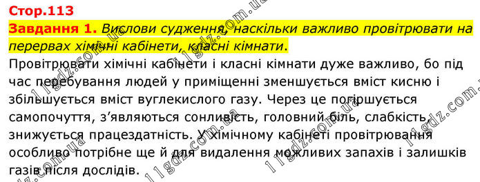 Завдання 1. Вислови судження, наскільки важливо провітрювати на перервах хімічні кабінети, класні кімнати. Провітрювати хімічні кабінети і класні кімнати дуже важливо, бо під час перебування людей у приміщенні зменшується вміст кисню і збільшується вміст вуглекислого газу. Через це погіршується самопочуття, з’являються сонливість, головний біль, слабкість, знижується працездатність. У хімічному кабінеті провітрювання особливо потрібне ще й для видалення можливих запахів і залишків газів після дослідів.