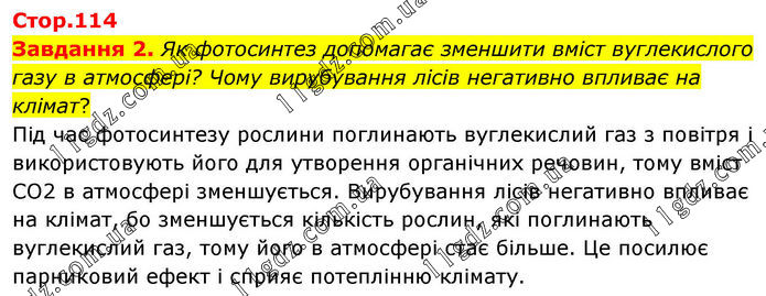 Завдання 2. Як фотосинтез допомагає зменшити вміст вуглекислого газу в атмосфері? Чому вирубування лісів негативно впливає на клімат? Під час фотосинтезу рослини поглинають вуглекислий газ з повітря і використовують його для утворення органічних речовин, тому вміст CO2 в атмосфері зменшується. Вирубування лісів негативно впливає на клімат, бо зменшується кількість рослин, які поглинають вуглекислий газ, тому його в атмосфері стає більше. Це посилює парниковий ефект і сприяє потеплінню клімату.
