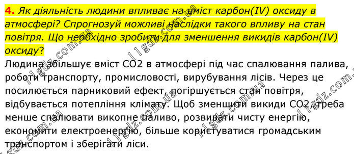 4. Як діяльність людини впливає на вміст карбон(IV) оксиду в атмосфері? Спрогнозуй можливі наслідки такого впливу на стан повітря. Що необхідно зробити для зменшення викидів карбон(IV) оксиду? Людина збільшує вміст CO2 в атмосфері під час спалювання палива, роботи транспорту, промисловості, вирубування лісів. Через це посилюється парниковий ефект, погіршується стан повітря, відбувається потепління клімату. Щоб зменшити викиди CO2, треба менше спалювати викопне паливо, розвивати чисту енергію, економити електроенергію, більше користуватися громадським транспортом і зберігати ліси.
