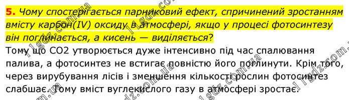 5. Чому спостерігається парниковий ефект, спричинений зростанням вмісту карбон(IV) оксиду в атмосфері, якщо у процесі фотосинтезу він поглинається, а кисень — виділяється? Тому що CO2 утворюється дуже інтенсивно під час спалювання палива, а фотосинтез не встигає повністю його поглинути. Крім того, через вирубування лісів і зменшення кількості рослин фотосинтез слабшає. Тому вміст вуглекислого газу в атмосфері зростає.