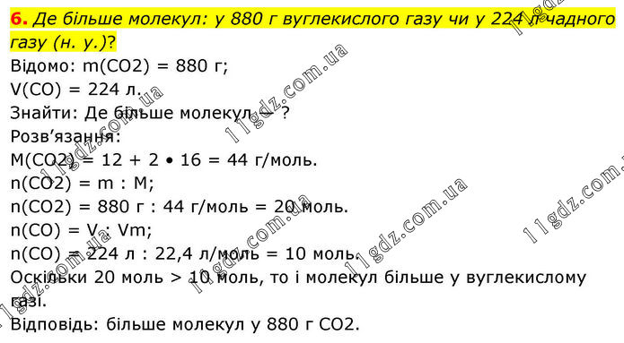 6. Де більше молекул: у 880 г вуглекислого газу чи у 224 л чадного газу (н. у.)? Відомо: m(CO2) = 880 г; V(CO) = 224 л. Знайти: Де більше молекул — ? Розв’язання: M(CO2) = 12 + 2 • 16 = 44 г/моль. n(CO2) = m : M; n(CO2) = 880 г : 44 г/моль = 20 моль. n(CO) = V : Vm; n(CO) = 224 л : 22,4 л/моль = 10 моль. Оскільки 20 моль > 10 моль, то і молекул більше у вуглекислому газі. Відповідь: більше молекул у 880 г CO2.