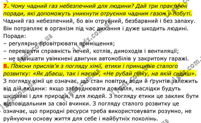 7. Чому чадний газ небезпечний для людини? Дай три практичні поради, які допоможуть уникнути отруєння чадним газом у побуті. Чадний газ небезпечний, бо він отруйний, безбарвний і без запаху. Він потрапляє в організм під час дихання і дуже шкодить людині. Поради: – регулярно провітрювати приміщення; – перевіряти справність печей, котлів, димоходів і вентиляції; – не залишати увімкнені двигуни автомобілів у закритому гаражі. 8. Поясни прислів’я з погляду хімії, етики і принципів сталого розвитку: «Як дбаєш, так і маєш», «Не рубай гілку, на якій сидиш». З погляду хімії це означає, що стан повітря, води й ґрунтів залежить від дій людини: якщо забруднювати довкілля, наслідки будуть шкідливі і для природи, і для людей. З погляду етики це заклик бути відповідальним за свої вчинки. З погляду сталого розвитку це означає, що природні ресурси треба використовувати розумно, не руйнуючи основу життя для себе і майбутніх поколінь.