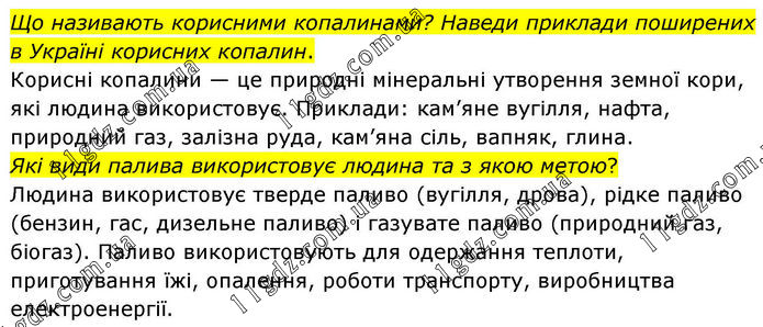 Що називають корисними копалинами? Наведи приклади поширених в Україні корисних копалин. Корисні копалини — це природні мінеральні утворення земної кори, які людина використовує. Приклади: кам’яне вугілля, нафта, природний газ, залізна руда, кам’яна сіль, вапняк, глина. Які види палива використовує людина та з якою метою? Людина використовує тверде паливо (вугілля, дрова), рідке паливо (бензин, гас, дизельне паливо) і газувате паливо (природний газ, біогаз). Паливо використовують для одержання теплоти, приготування їжі, опалення, роботи транспорту, виробництва електроенергії.