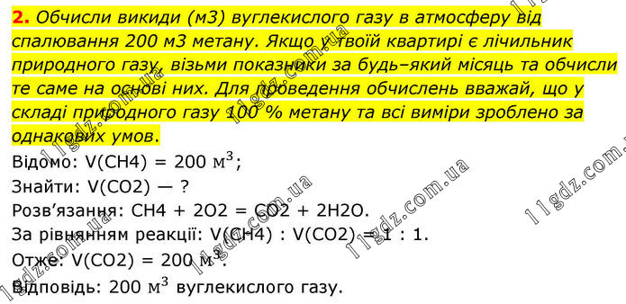 2. Обчисли викиди (м3) вуглекислого газу в атмосферу від спалювання 200 м3 метану. Якщо у твоїй квартирі є лічильник природного газу, візьми показники за будь–який місяць та обчисли те саме на основі них. Для проведення обчислень вважай, що у складі природного газу 100 % метану та всі виміри зроблено за однакових умов. Відомо: V(CH4) = 200 м^3; Знайти: V(CO2) — ? Розв’язання: CH4 + 2O2 = CO2 + 2H2O. За рівнянням реакції: V(CH4) : V(CO2) = 1 : 1. Отже: V(CO2) = 200 м^3. Відповідь: 200 м^3 вуглекислого газу.