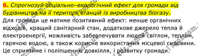 6. Спрогнозуй соціально–екологічний ефект для громади від будівництва на її території станцій із виробництва біогазу. Для громади це матиме позитивний ефект: менше органічних відходів, кращий санітарний стан, додаткове джерело тепла й електроенергії, можливість забезпечувати людей світлом, теплом, гарячою водою, а також корисне використання місцевої сировини. Це сприятиме і поліпшенню довкілля, і розвитку громади.