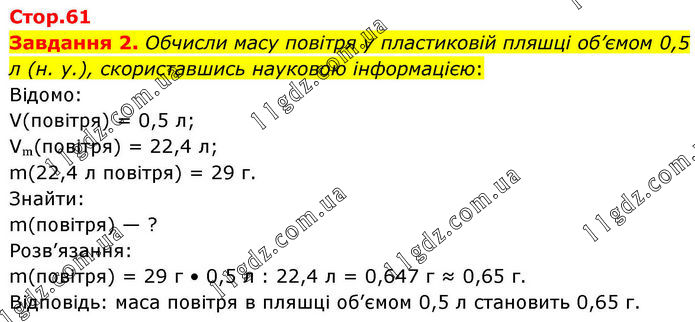 Завдання 2. Обчисли масу повітря у пластиковій пляшці об’ємом 0,5 л (н. у.), скориставшись науковою інформацією: Відомо: V(повітря) = 0,5 л; Vₘ(повітря) = 22,4 л; m(22,4 л повітря) = 29 г. Знайти: m(повітря) — ? Розв’язання: m(повітря) = 29 г • 0,5 л : 22,4 л = 0,647 г ≈ 0,65 г. Відповідь: маса повітря в пляшці об’ємом 0,5 л становить 0,65 г.