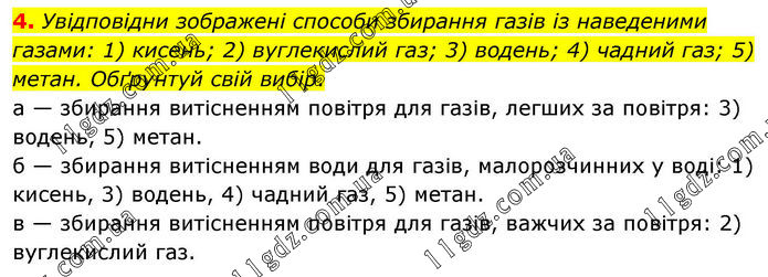4. Увідповідни зображені способи збирання газів із наведеними газами: 1) кисень; 2) вуглекислий газ; 3) водень; 4) чадний газ; 5) метан. Обґрунтуй свій вибір. а — збирання витісненням повітря для газів, легших за повітря: 3) водень, 5) метан. б — збирання витісненням води для газів, малорозчинних у воді: 1) кисень, 3) водень, 4) чадний газ, 5) метан. в — збирання витісненням повітря для газів, важчих за повітря: 2) вуглекислий газ.
