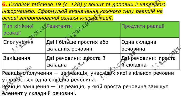 6. Скопіюй таблицю 19 (с. 128) у зошит та доповни її належною інформацією. Сформулюй визначення кожного типу реакцій на основі запропонованої ознаки класифікації. Реакція сполучення — це реакція, унаслідок якої з кількох речовин утворюється одна складна речовина. Реакція заміщення — це реакція, у якій проста речовина заміщує елемент у складній речовині.