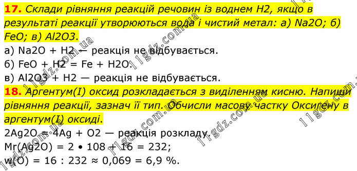 17. Склади рівняння реакцій речовин із воднем Н2, якщо в результаті реакції утворюються вода і чистий метал: а) Na2O; б) FeO; в) Al2O3. а) Na2O + H2 — реакція не відбувається. б) FeO + H2 = Fe + H2O. в) Al2O3 + H2 — реакція не відбувається. 18. Аргентум(І) оксид розкладається з виділенням кисню. Напиши рівняння реакції, зазнач її тип. Обчисли масову частку Оксигену в аргентум(І) оксиді. 2Ag2O = 4Ag + O2 — реакція розкладу. Mr(Ag2O) = 2 • 108 + 16 = 232; w(O) = 16 : 232 ≈ 0,069 = 6,9 %.