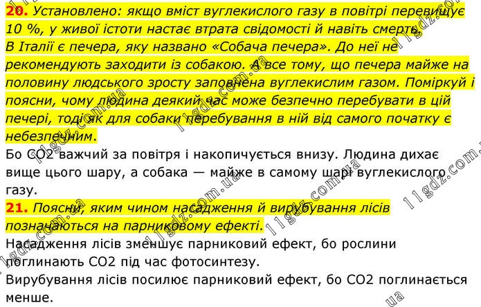 20. Установлено: якщо вміст вуглекислого газу в повітрі перевищує 10 %, у живої істоти настає втрата свідомості й навіть смерть. В Італії є печера, яку названо «Собача печера». До неї не рекомендують заходити із собакою. А все тому, що печера майже на половину людського зросту заповнена вуглекислим газом. Поміркуй і поясни, чому людина деякий час може безпечно перебувати в цій печері, тоді як для собаки перебування в ній від самого початку є небезпечним. Бо CO2 важчий за повітря і накопичується внизу. Людина дихає вище цього шару, а собака — майже в самому шарі вуглекислого газу. 21. Поясни, яким чином насадження й вирубування лісів позначаються на парниковому ефекті. Насадження лісів зменшує парниковий ефект, бо рослини поглинають CO2 під час фотосинтезу. Вирубування лісів посилює парниковий ефект, бо CO2 поглинається менше.