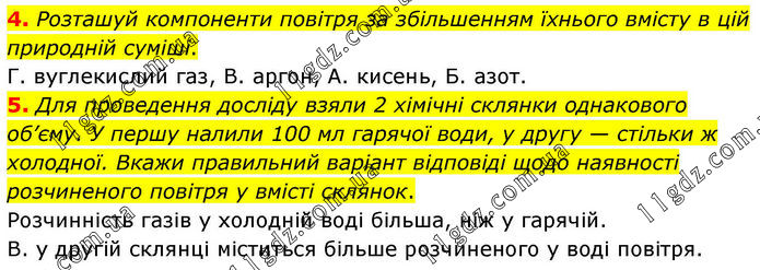 4. Розташуй компоненти повітря за збільшенням їхнього вмісту в цій природній суміші. Г. вуглекислий газ, В. аргон, А. кисень, Б. азот. 5. Для проведення досліду взяли 2 хімічні склянки однакового об’єму. У першу налили 100 мл гарячої води, у другу — стільки ж холодної. Вкажи правильний варіант відповіді щодо наявності розчиненого повітря у вмісті склянок. Розчинність газів у холодній воді більша, ніж у гарячій. В. у другій склянці міститься більше розчиненого у воді повітря.