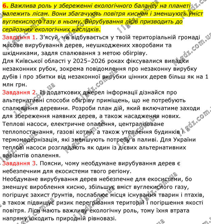 6. Важлива роль у збереженні екологічного балансу на планеті належить лісам. Вони збагачують повітря киснем і зменшують уміст вуглекислого газу в ньому. Вирубування лісів призводить до серйозних екологічних наслідків. Завдання 1. З’ясуй, чи відбувається у твоїй територіальній громаді масове вирубування дерев, неушкоджених хворобами та шкідниками, задля спалювання з метою обігріву. Для Київської області у 2025–2026 роках фіксувалися випадки незаконних рубок, зокрема повідомлення про незаконну вирубку дубів і про збитки від незаконної вирубки цінних дерев більш як на 1 млн грн. Завдання 2. Із додаткових джерел інформації дізнайся про альтернативні способи обігріву приміщень, що не потребують спалювання деревини. Розроби план дій, який включатиме заходи для збереження наявних дерев, а також насадження нових. Теплові насоси, електричне опалення, централізоване теплопостачання, газові котли, а також утеплення будинків і термомодернізація, які зменшують потребу в паливі. Для України теплові насоси розглядають як один із дієвих альтернативних варіантів опалення. Завдання 3. Поясни, чому необдумане вирубування дерев є небезпечним для екосистеми твого регіону. Необдумане вирубування дерев небезпечне для екосистеми, бо зменшує вироблення кисню, збільшує вміст вуглекислого газу, погіршує захист ґрунтів, послаблює місця існування тварин і птахів, а також підвищує ризик перегрівання територій і погіршення якості повітря. Ліси мають важливу екологічну роль, тому їхня втрата напряму шкодить природній рівновазі.
