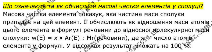 Що означають та як обчислити масові частки елементів у сполуці? Масова частка елемента показує, яка частина маси сполуки припадає на цей елемент. Її обчислюють як відношення маси атомів цього елемента в формулі речовини до відносної молекулярної маси сполуки: w(E) = x • Ar(E) : Mr(речовини), де x — число атомів елемента у формулі. У відсотках результат множать на 100 %.