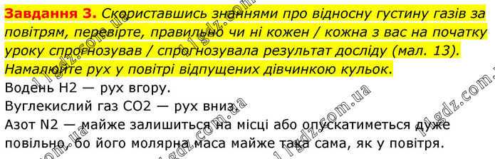 Завдання 3. Скориставшись знаннями про відносну густину газів за повітрям, перевірте, правильно чи ні кожен / кожна з вас на початку уроку спрогнозував / спрогнозувала результат досліду (мал. 13). Намалюйте рух у повітрі відпущених дівчинкою кульок. Водень H2 — рух вгору. Вуглекислий газ CO2 — рух вниз. Азот N2 — майже залишиться на місці або опускатиметься дуже повільно, бо його молярна маса майже така сама, як у повітря.