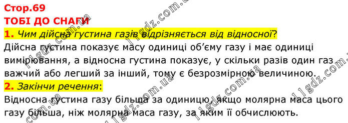 ТОБІ ДО СНАГИ 1. Чим дійсна густина газів відрізняється від відносної? Дійсна густина показує масу одиниці об’єму газу і має одиниці вимірювання, а відносна густина показує, у скільки разів один газ важчий або легший за інший, тому є безрозмірною величиною. 2. Закінчи речення: Відносна густина газу більша за одиницю, якщо молярна маса цього газу більша, ніж молярна маса газу, за яким її обчислюють.