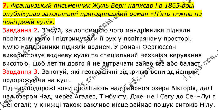 7. Французький письменник Жуль Верн написав і в 1863 році опублікував захопливий пригодницький роман «П’ять тижнів на повітряній кулі». Завдання 2. З’ясуй, за допомогою чого мандрівники підняли повітряну кулю і підтримували її рух у повітряному просторі. Кулю мандрівники підняли воднем. У романі Фергюссон використовує водневу кулю та спеціальний механізм керування висотою, щоб летіти довго й не витрачати зайво газ або баласт. Завдання 3. Занотуй, які географічні відкриття вони здійснили, подорожуючи на кулі. Під час подорожі вони пролітають над районом озера Вікторія, далі над озером Чад, через Агадес, Тімбукту, Дженне і Сегу до Сен–Луї в Сенегалі; у книжці також важливе місце займає пошук витоків Нілу.