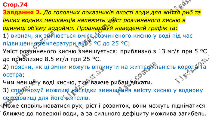 Завдання 2. До головних показників якості води для життя риб та інших водних мешканців належить уміст розчиненого кисню в одиниці об’єму водойми. Проаналізуй наведений графік та: 1) визнач, як змінюється вміст розчиненого кисню у воді під час підвищення температури від 5 °С до 25 °С; Уміст розчиненого кисню зменшується: приблизно з 13 мг/л при 5 °C до приблизно 8,5 мг/л при 25 °C. 2) поясни, як ці зміни можуть вплинути на життєдіяльність коропа та осетра; Чим менше у воді кисню, тим важче рибам дихати. 3) спрогнозуй можливі наслідки зменшення вмісту кисню у водному середовищі для його жителів. Може сповільнюватися рух, ріст і розвиток, вони можуть підніматися ближче до поверхні води, а за сильного дефіциту можлива загибель.