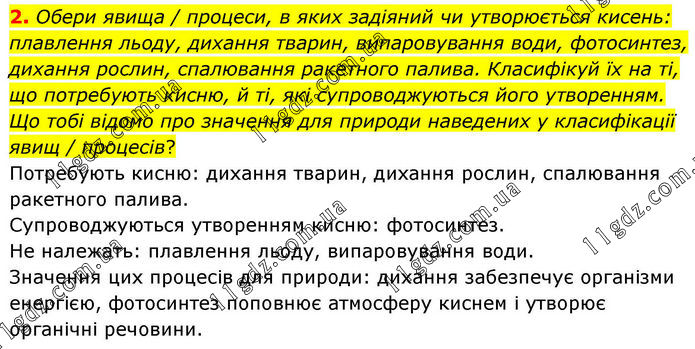 2. Обери явища / процеси, в яких задіяний чи утворюється кисень: плавлення льоду, дихання тварин, випаровування води, фотосинтез, дихання рослин, спалювання ракетного палива. Класифікуй їх на ті, що потребують кисню, й ті, які супроводжуються його утворенням. Що тобі відомо про значення для природи наведених у класифікації явищ / процесів? Потребують кисню: дихання тварин, дихання рослин, спалювання ракетного палива. Супроводжуються утворенням кисню: фотосинтез. Не належать: плавлення льоду, випаровування води. Значення цих процесів для природи: дихання забезпечує організми енергією, фотосинтез поповнює атмосферу киснем і утворює органічні речовини.
