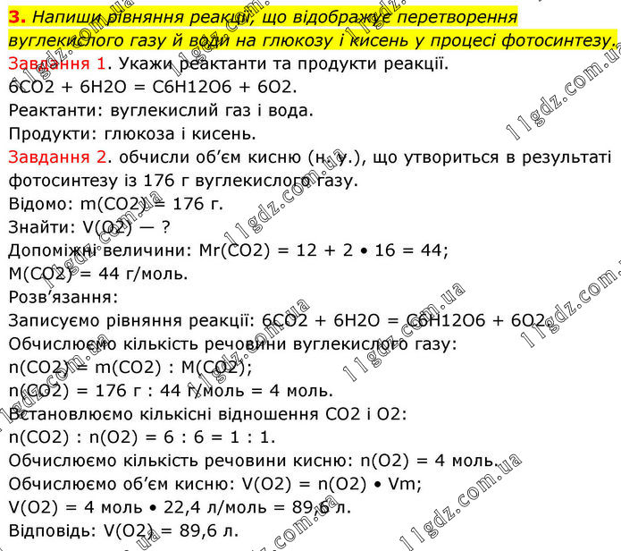 3. Напиши рівняння реакції, що відображує перетворення вуглекислого газу й води на глюкозу і кисень у процесі фотосинтезу. Завдання 1. Укажи реактанти та продукти реакції. 6CO2 + 6H2O = C6H12O6 + 6O2. Реактанти: вуглекислий газ і вода. Продукти: глюкоза і кисень. Завдання 2. обчисли об’єм кисню (н. у.), що утвориться в результаті фотосинтезу із 176 г вуглекислого газу. Відомо: m(CO2) = 176 г. Знайти: V(O2) — ? Допоміжні величини: Mr(CO2) = 12 + 2 • 16 = 44; M(CO2) = 44 г/моль. Розв’язання: Записуємо рівняння реакції: 6CO2 + 6H2O = C6H12O6 + 6O2. Обчислюємо кількість речовини вуглекислого газу: n(CO2) = m(CO2) : M(CO2); n(CO2) = 176 г : 44 г/моль = 4 моль. Встановлюємо кількісні відношення CO2 і O2: n(CO2) : n(O2) = 6 : 6 = 1 : 1. Обчислюємо кількість речовини кисню: n(O2) = 4 моль. Обчислюємо об’єм кисню: V(O2) = n(O2) • Vm; V(O2) = 4 моль • 22,4 л/моль = 89,6 л. Відповідь: V(O2) = 89,6 л.