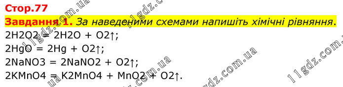 Завдання 1. За наведеними схемами напишіть хімічні рівняння. 2H2O2 = 2H2O + O2↑; 2HgO = 2Hg + O2↑; 2NaNO3 = 2NaNO2 + O2↑; 2KMnO4 = K2MnO4 + MnO2 + O2↑.