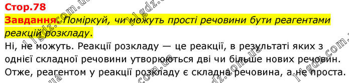 Завдання. Поміркуй, чи можуть прості речовини бути реагентами реакцій розкладу. Ні, не можуть. Реакції розкладу — це реакції, в результаті яких з однієї складної речовини утворюються дві чи більше нових речовин. Отже, реагентом у реакції розкладу є складна речовина, а не проста.