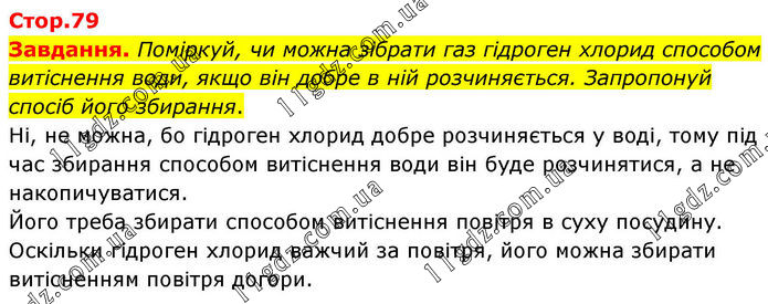 Завдання. Поміркуй, чи можна зібрати газ гідроген хлорид способом витіснення води, якщо він добре в ній розчиняється. Запропонуй спосіб його збирання. Ні, не можна, бо гідроген хлорид добре розчиняється у воді, тому під час збирання способом витіснення води він буде розчинятися, а не накопичуватися. Його треба збирати способом витіснення повітря в суху посудину. Оскільки гідроген хлорид важчий за повітря, його можна збирати витісненням повітря догори.