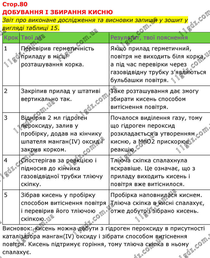 ДОБУВАННЯ І ЗБИРАННЯ КИСНЮ Звіт про виконане дослідження та висновки запиши у зошит у вигляді таблиці 15. Висновок: кисень можна добути з гідроген пероксиду в присутності каталізатора манган(IV) оксиду і зібрати способом витіснення повітря. Кисень підтримує горіння, тому тліюча скіпка в ньому спалахує.