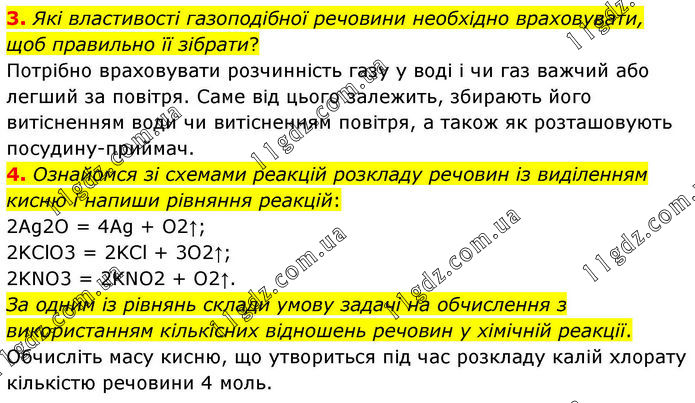 3. Які властивості газоподібної речовини необхідно враховувати, щоб правильно її зібрати? Потрібно враховувати розчинність газу у воді і чи газ важчий або легший за повітря. Саме від цього залежить, збирають його витісненням води чи витісненням повітря, а також як розташовують посудину–приймач. 4. Ознайомся зі схемами реакцій розкладу речовин із виділенням кисню і напиши рівняння реакцій: 2Ag2O = 4Ag + O2↑; 2KClO3 = 2KCl + 3O2↑; 2KNO3 = 2KNO2 + O2↑. За одним із рівнянь склади умову задачі на обчислення з використанням кількісних відношень речовин у хімічній реакції. Обчисліть масу кисню, що утвориться під час розкладу калій хлорату кількістю речовини 4 моль.