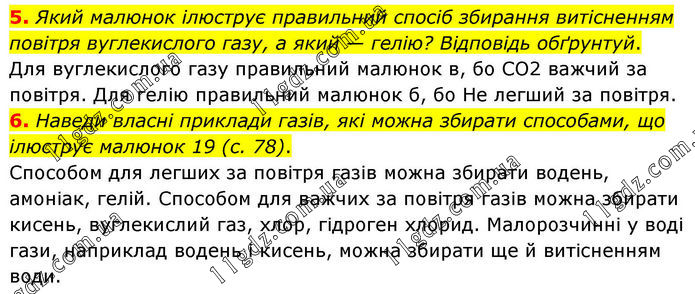 5. Який малюнок ілюструє правильний спосіб збирання витісненням повітря вуглекислого газу, а який — гелію? Відповідь обґрунтуй. Для вуглекислого газу правильний малюнок в, бо CO2 важчий за повітря. Для гелію правильний малюнок б, бо He легший за повітря. 6. Наведи власні приклади газів, які можна збирати способами, що ілюструє малюнок 19 (с. 78). Способом для легших за повітря газів можна збирати водень, амоніак, гелій. Способом для важчих за повітря газів можна збирати кисень, вуглекислий газ, хлор, гідроген хлорид. Малорозчинні у воді гази, наприклад водень і кисень, можна збирати ще й витісненням води.