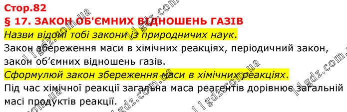 § 17. ЗАКОН ОБ'ЄМНИХ ВІДНОШЕНЬ ГАЗІВ Назви відомі тобі закони із природничих наук. Закон збереження маси в хімічних реакціях, періодичний закон, закон об’ємних відношень газів. Сформулюй закон збереження маси в хімічних реакціях. Під час хімічної реакції загальна маса реагентів дорівнює загальній масі продуктів реакції.