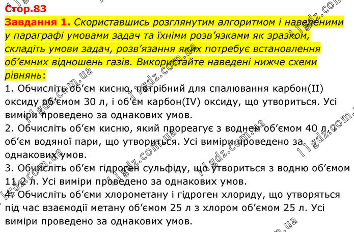 Завдання 1. Скориставшись розглянутим алгоритмом і наведеними у параграфі умовами задач та їхніми розв’язками як зразком, складіть умови задач, розв’язання яких потребує встановлення об’ємних відношень газів. Використайте наведені нижче схеми рівнянь: 1. Обчисліть об’єм кисню, потрібний для спалювання карбон(ІІ) оксиду об’ємом 30 л, і об’єм карбон(IV) оксиду, що утвориться. Усі виміри проведено за однакових умов. 2. Обчисліть об’єм кисню, який прореагує з воднем об’ємом 40 л, і об’єм водяної пари, що утвориться. Усі виміри проведено за однакових умов. 3. Обчисліть об’єм гідроген сульфіду, що утвориться з водню об’ємом 11,2 л. Усі виміри проведено за однакових умов. 4. Обчисліть об’єми хлорометану і гідроген хлориду, що утворяться під час взаємодії метану об’ємом 25 л з хлором об’ємом 25 л. Усі виміри проведено за однакових умов.