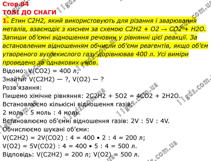 ТОБІ ДО СНАГИ 1. Етин С2Н2, який використовують для різання і зварювання металів, взаємодіє з киснем за схемою C2H2 + О2 → СО2 + Н2О. Запиши об’ємні відношення речовин у рівнянні цієї реакції. За встановленим відношенням обчисли об’єми реагентів, якщо об’єм утвореного вуглекислого газу дорівнював 400 л. Усі виміри проведено за однакових умов. Відомо: V(CO2) = 400 л; Знайти: V(C2H2) — ?, V(O2) — ? Розв’язання: Пишемо хімічне рівняння: 2C2H2 + 5O2 = 4CO2 + 2H2O. Встановлюємо кількісні відношення газів: 2 моль : 5 моль : 4 моль. Встановлюємо об’ємні відношення газів: 2V : 5V : 4V. Обчислюємо шукані об’єми: V(C2H2) = 2V(CO2) : 4 = 400 • 2 : 4 = 200 л; V(O2) = 5V(CO2) : 4 = 400 • 5 : 4 = 500 л. Відповідь: V(C2H2) = 200 л; V(O2) = 500 л.