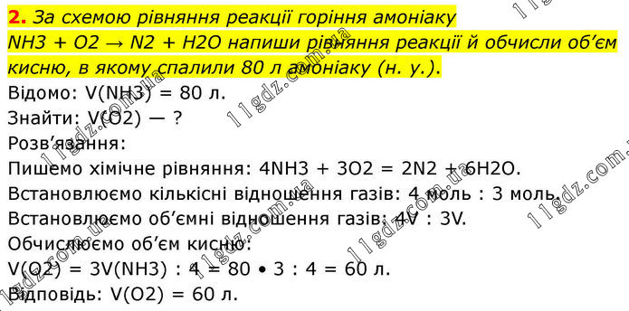 2. За схемою рівняння реакції горіння амоніаку NH3 + O2 → N2 + H2O напиши рівняння реакції й обчисли об’єм кисню, в якому спалили 80 л амоніаку (н. у.). Відомо: V(NH3) = 80 л. Знайти: V(O2) — ? Розв’язання: Пишемо хімічне рівняння: 4NH3 + 3O2 = 2N2 + 6H2O. Встановлюємо кількісні відношення газів: 4 моль : 3 моль. Встановлюємо об’ємні відношення газів: 4V : 3V. Обчислюємо об’єм кисню: V(O2) = 3V(NH3) : 4 = 80 • 3 : 4 = 60 л. Відповідь: V(O2) = 60 л.