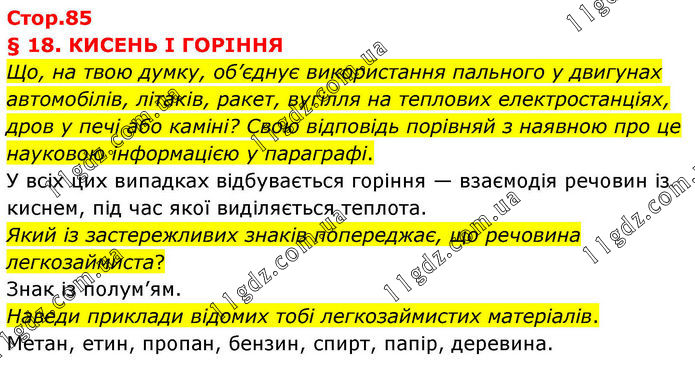 § 18. КИСЕНЬ І ГОРІННЯ Що, на твою думку, об’єднує використання пального у двигунах автомобілів, літаків, ракет, вугілля на теплових електростанціях, дров у печі або каміні? Свою відповідь порівняй з наявною про це науковою інформацією у параграфі. У всіх цих випадках відбувається горіння — взаємодія речовин із киснем, під час якої виділяється теплота. Який із застережливих знаків попереджає, що речовина легкозаймиста? Знак із полум’ям. Наведи приклади відомих тобі легкозаймистих матеріалів. Метан, етин, пропан, бензин, спирт, папір, деревина.