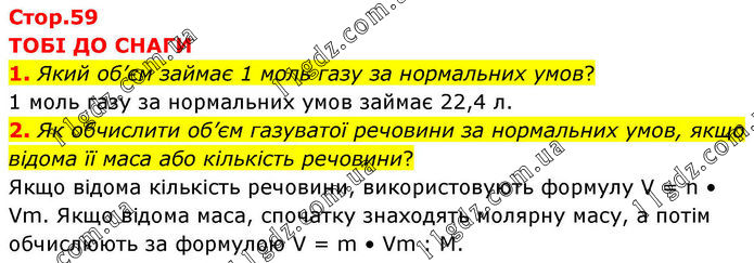 ТОБІ ДО СНАГИ 1. Який об’єм займає 1 моль газу за нормальних умов? 1 моль газу за нормальних умов займає 22,4 л. 2. Як обчислити об’єм газуватої речовини за нормальних умов, якщо відома її маса або кількість речовини? Якщо відома кількість речовини, використовують формулу V = n • Vm. Якщо відома маса, спочатку знаходять молярну масу, а потім обчислюють за формулою V = m • Vm : M.