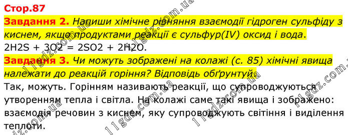 Завдання 2. Напиши хімічне рівняння взаємодії гідроген сульфіду з киснем, якщо продуктами реакції є сульфур(IV) оксид і вода. 2H2S + 3O2 = 2SO2 + 2H2O. Завдання 3. Чи можуть зображені на колажі (с. 85) хімічні явища належати до реакцій горіння? Відповідь обґрунтуй. Так, можуть. Горінням називають реакції, що супроводжуються утворенням тепла і світла. На колажі саме такі явища і зображено: взаємодія речовин з киснем, яку супроводжують світіння і виділення теплоти.