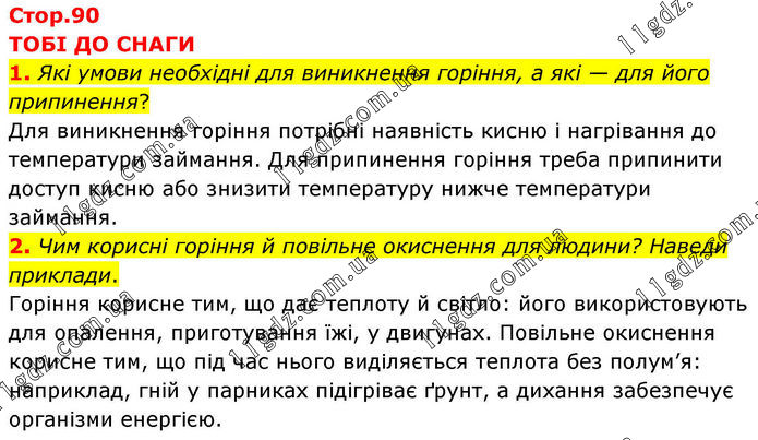 ТОБІ ДО СНАГИ 1. Які умови необхідні для виникнення горіння, а які — для його припинення? Для виникнення горіння потрібні наявність кисню і нагрівання до температури займання. Для припинення горіння треба припинити доступ кисню або знизити температуру нижче температури займання. 2. Чим корисні горіння й повільне окиснення для людини? Наведи приклади. Горіння корисне тим, що дає теплоту й світло: його використовують для опалення, приготування їжі, у двигунах. Повільне окиснення корисне тим, що під час нього виділяється теплота без полум’я: наприклад, гній у парниках підігріває ґрунт, а дихання забезпечує організми енергією.