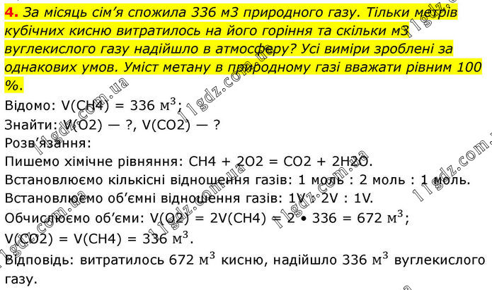 4. За місяць сім’я спожила 336 м3 природного газу. Тільки метрів кубічних кисню витратилось на його горіння та скільки м3 вуглекислого газу надійшло в атмосферу? Усі виміри зроблені за однакових умов. Уміст метану в природному газі вважати рівним 100 %. Відомо: V(CH4) = 336 м^3; Знайти: V(O2) — ?, V(CO2) — ? Розв’язання: Пишемо хімічне рівняння: CH4 + 2O2 = CO2 + 2H2O. Встановлюємо кількісні відношення газів: 1 моль : 2 моль : 1 моль. Встановлюємо об’ємні відношення газів: 1V : 2V : 1V. Обчислюємо об’єми: V(O2) = 2V(CH4) = 2 • 336 = 672 м^3; V(CO2) = V(CH4) = 336 м^3. Відповідь: витратилось 672 м^3 кисню, надійшло 336 м^3 вуглекислого газу.