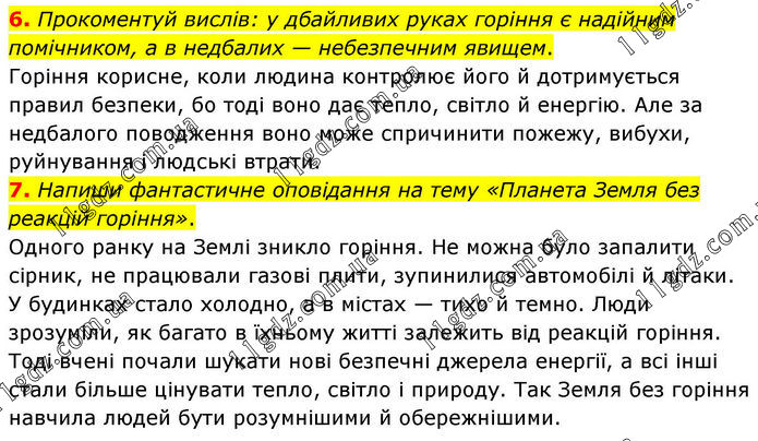 6. Прокоментуй вислів: у дбайливих руках горіння є надійним помічником, а в недбалих — небезпечним явищем. Горіння корисне, коли людина контролює його й дотримується правил безпеки, бо тоді воно дає тепло, світло й енергію. Але за недбалого поводження воно може спричинити пожежу, вибухи, руйнування і людські втрати. 7. Напиши фантастичне оповідання на тему «Планета Земля без реакцій горіння». Одного ранку на Землі зникло горіння. Не можна було запалити сірник, не працювали газові плити, зупинилися автомобілі й літаки. У будинках стало холодно, а в містах — тихо й темно. Люди зрозуміли, як багато в їхньому житті залежить від реакцій горіння. Тоді вчені почали шукати нові безпечні джерела енергії, а всі інші стали більше цінувати тепло, світло і природу. Так Земля без горіння навчила людей бути розумнішими й обережнішими.
