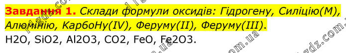 Завдання 1. Склади формули оксидів: Гідрогену, Силіцію(М), Алюмінію, Kap6oHy(IV), Феруму(ІІ), Феруму(ІІІ). H2O, SiO2, Al2O3, CO2, FeO, Fe2O3.