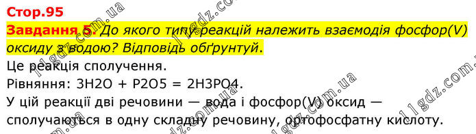 Завдання 5. До якого типу реакцій належить взаємодія фосфор(V) оксиду з водою? Відповідь обґрунтуй. Це реакція сполучення. Рівняння: 3H2O + P2O5 = 2H3PO4. У цій реакції дві речовини — вода і фосфор(V) оксид — сполучаються в одну складну речовину, ортофосфатну кислоту.