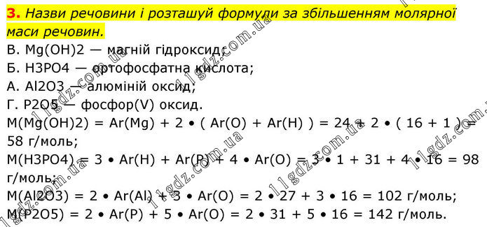 3. Назви речовини і розташуй формули за збільшенням молярної маси речовин. В. Mg(OH)2 — магній гідроксид; Б. H3PO4 — ортофосфатна кислота; А. Al2O3 — алюміній оксид; Г. P2O5 — фосфор(V) оксид. M(Mg(OH)2) = Ar(Mg) + 2 • ( Ar(O) + Ar(H) ) = 24 + 2 • ( 16 + 1 ) = 58 г/моль; M(H3PO4) = 3 • Ar(H) + Ar(P) + 4 • Ar(O) = 3 • 1 + 31 + 4 • 16 = 98 г/моль; M(Al2O3) = 2 • Ar(Al) + 3 • Ar(O) = 2 • 27 + 3 • 16 = 102 г/моль; M(P2O5) = 2 • Ar(P) + 5 • Ar(O) = 2 • 31 + 5 • 16 = 142 г/моль.