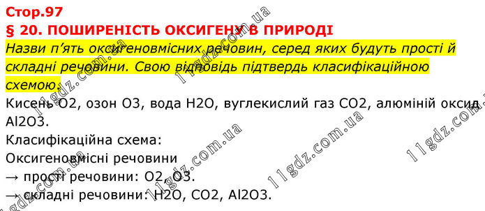 § 20. ПОШИРЕНІСТЬ ОКСИГЕНУ В ПРИРОДІ Назви п’ять оксигеновмісних речовин, серед яких будуть прості й складні речовини. Свою відповідь підтвердь класифікаційною схемою. Кисень O2, озон O3, вода H2O, вуглекислий газ CO2, алюміній оксид Al2O3. Класифікаційна схема: Оксигеновмісні речовини → прості речовини: O2, O3. → складні речовини: H2O, CO2, Al2O3.
