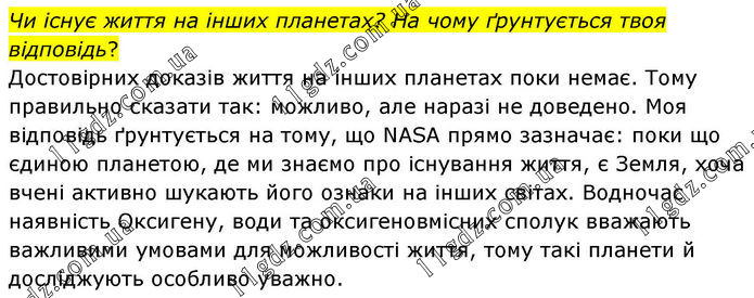 Чи існує життя на інших планетах? На чому ґрунтується твоя відповідь? Достовірних доказів життя на інших планетах поки немає. Тому правильно сказати так: можливо, але наразі не доведено. Моя відповідь ґрунтується на тому, що NASA прямо зазначає: поки що єдиною планетою, де ми знаємо про існування життя, є Земля, хоча вчені активно шукають його ознаки на інших світах. Водночас наявність Оксигену, води та оксигеновмісних сполук вважають важливими умовами для можливості життя, тому такі планети й досліджують особливо уважно.