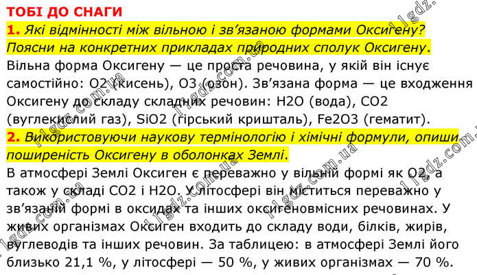ТОБІ ДО СНАГИ 1. Які відмінності між вільною і зв’язаною формами Оксигену? Поясни на конкретних прикладах природних сполук Оксигену. Вільна форма Оксигену — це проста речовина, у якій він існує самостійно: O2 (кисень), O3 (озон). Зв’язана форма — це входження Оксигену до складу складних речовин: H2O (вода), CO2 (вуглекислий газ), SiO2 (гірський кришталь), Fe2O3 (гематит). 2. Використовуючи наукову термінологію і хімічні формули, опиши поширеність Оксигену в оболонках Землі. В атмосфері Землі Оксиген є переважно у вільній формі як O2, а також у складі CO2 і H2O. У літосфері він міститься переважно у зв’язаній формі в оксидах та інших оксигеновмісних речовинах. У живих організмах Оксиген входить до складу води, білків, жирів, вуглеводів та інших речовин. За таблицею: в атмосфері Землі його близько 21,1 %, у літосфері — 50 %, у живих організмах — 70 %.